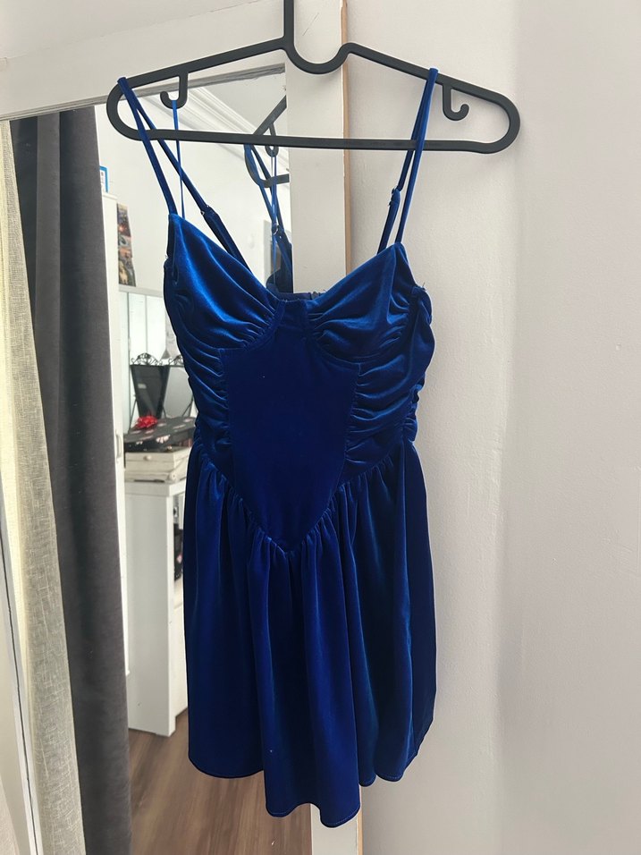 Parlak mavi kumaştan, ince askılı ve drapeli, vücuda oturan mini abiye elbise. Biraz kısa geldiği için kullanamadım o yüzden satıyorum