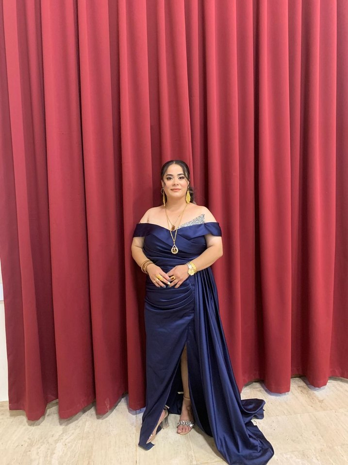 Parlak lacivert, straplez, drapeli, uzun ve fitted kesim abiye. Strappy kollu, gösterişli düğünler için uygun.