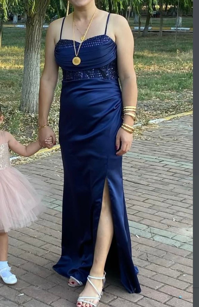 1 kez kulanıldı Drapeli tasarımı, askılı kolları ve straplez yakasıyla parlayan lacivert uzun abiye elbise. Yan yırtmaç detayı şıklık katıyor. ✨