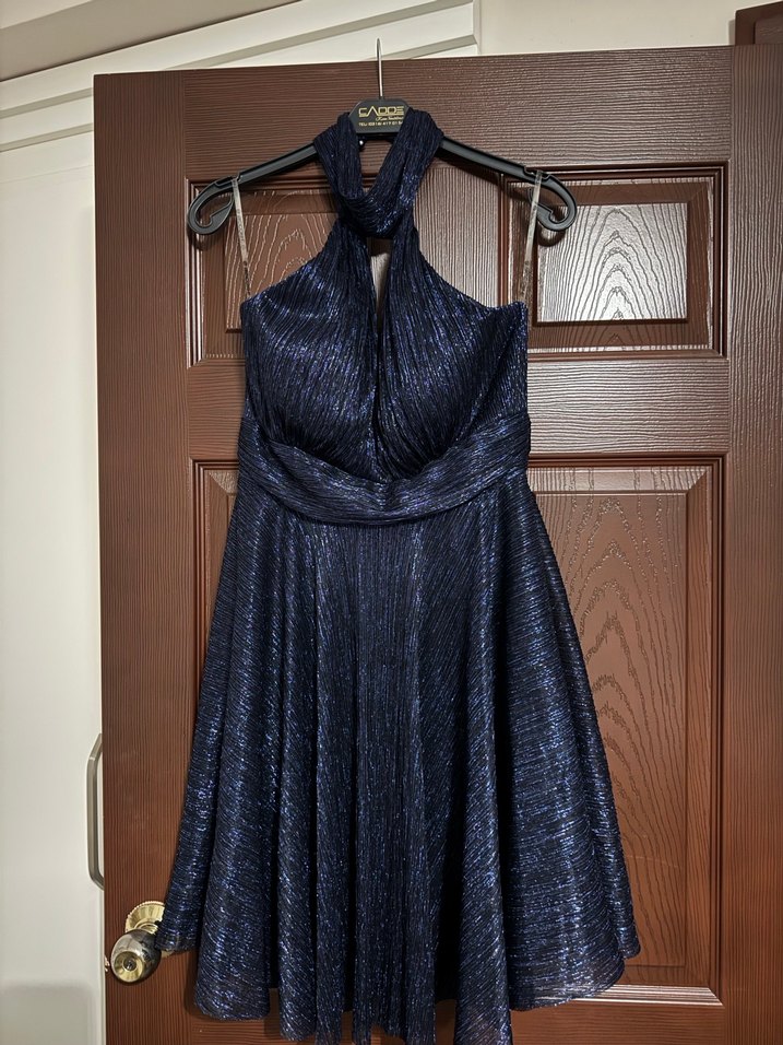 Parlak lacivert kumaştan, drapeli ve halter yakalı, ince askılı uzun abiye elbise. Gotik tarzda parti için uygun.