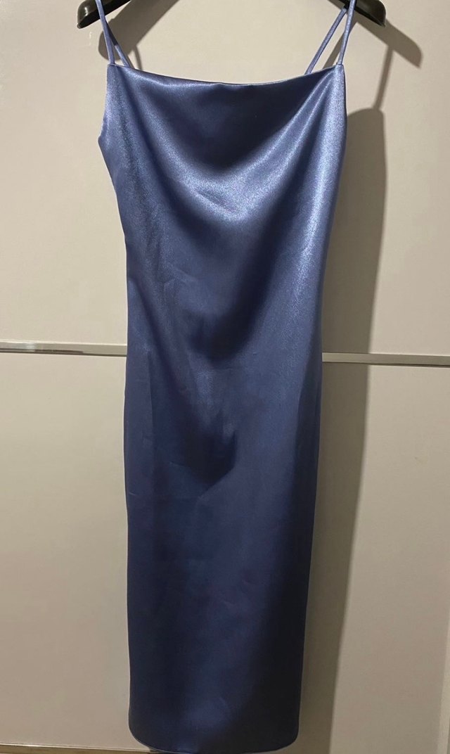 Parlak lacivert renkli, ince askılı,uzun ve vücuda oturan elbise. Yırtmaç detaylı.
