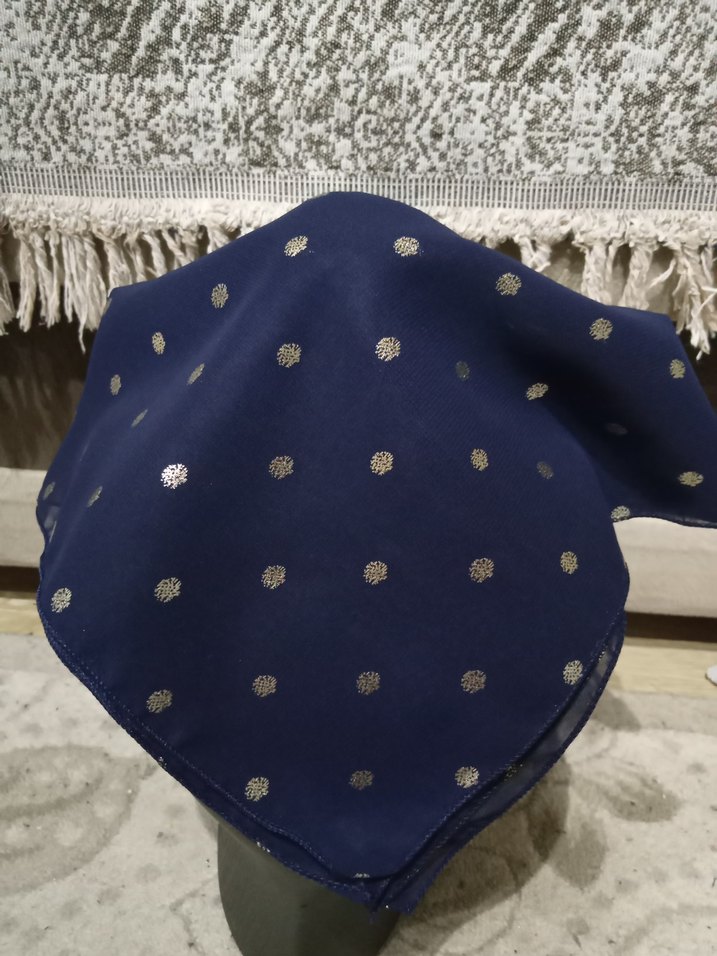Kadınlar için parlak sentetik kumaştan, lacivert renginde ve küçük gümüş noktalarla süslenmiş drapeli fular. Rahat ve bohem tarz için uygundur.