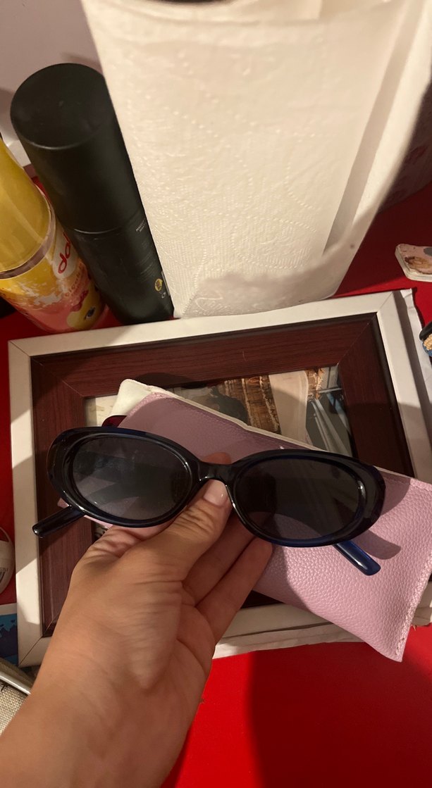 Parlak lacivert renkli, oval çerçeveli kadın güneş gözlüğü,