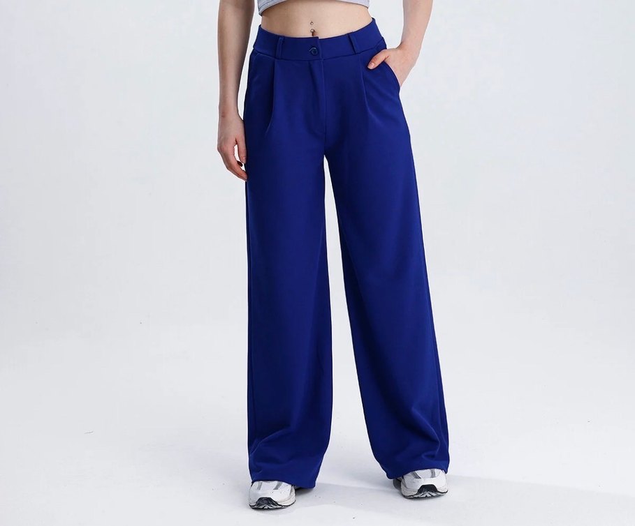 Parlak lacivert renkte, sentetik kumaştan üretilmiş, midi boy ve regular fit kadın kumaş pantolon. Günlük kullanım için rahat ve şık görünüme sahiptir.