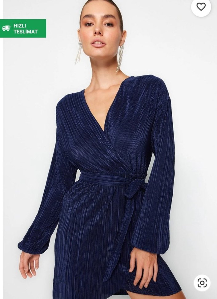 Parlak lacivert renkte, uzun kollu, beli oturan ve midi boyda kadın elbisesi. Kuşaklı bir model Buradan aldım bol geldi etiketi 40 ama 42 ye xl bedene daha iyi olur bence