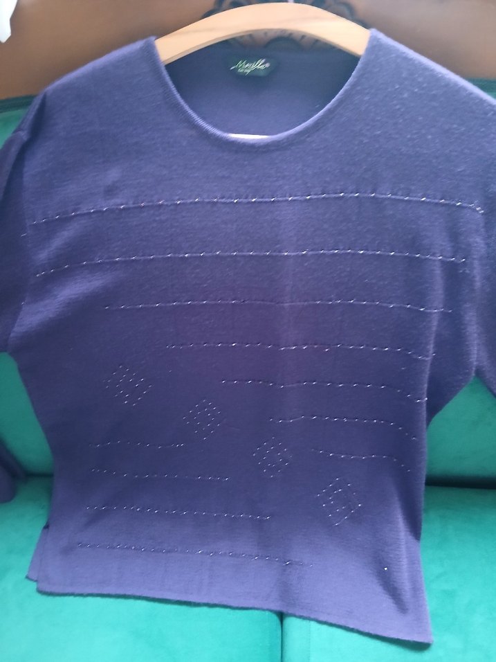 Parlak detaylara sahip, yuvarlak yakalı ve uzun kollu lacivert triko. Rahat kesimli ve normal boydadır, günlük kullanım için uygundur. sadece bir yerde minik boncuk düşmüş