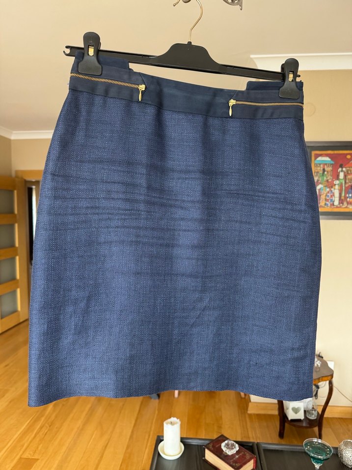 Parlak lacivert iki fermuar detaylı midi kalem etek. Ofis kullanımı için uygun.
