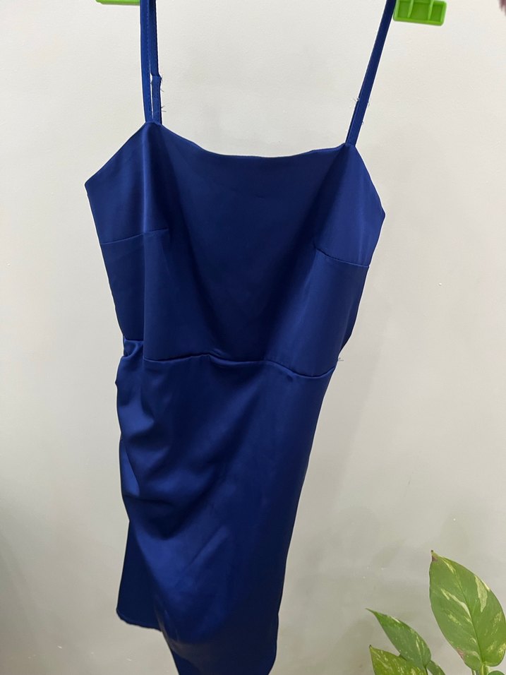 Dar kesim, ince askılı ve straplez yakalı lacivert gece elbisesi. Drape detaylı yırtmaçlı. Parlak dokusu ve mini boyuyla parti için uygun.