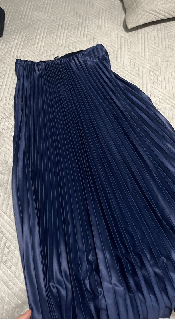 Bu bol kesim, uzun lacivert etek ince pililer ve parlak bir yüzeye sahiptir. Pürüzsüz sentetik kumaştan yapılmış olup, bohem tarzı ve Paris esintisi sunar. Günlük kullanım için uygundur.