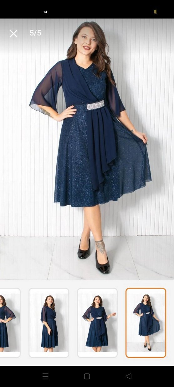 Parlak lacivert kumaştan, piliseli ve salaş kesim uzun abiye elbise. Askılı tekne yakalı, şeffaf kollu ve kemerli detaylı, çağdaş ve klasik şıklığı bir arada sunar. 1 kez giyildi 46 beden .. Göbek saklayan elbise