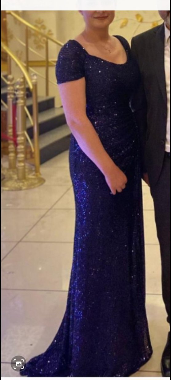 Lacivert, simli, modern klasik tarzda, uzun ve vücuda oturan abiye elbise. ✨