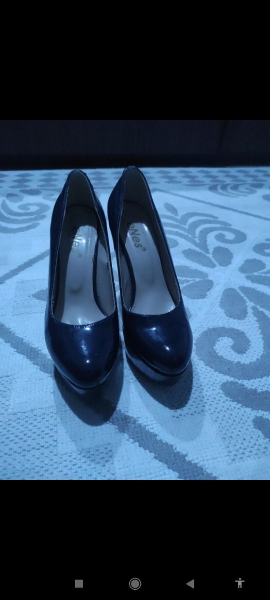 Parlak yüzeye sahip lacivert stiletto topuklu ayakkabılar, klasik gotik tarzda ve kauçuk malzemeden üretilmiştir. Ofis kullanımı için uygundur, desensiz ve lacivert renklidir.Az kullanılmış temiz üründür