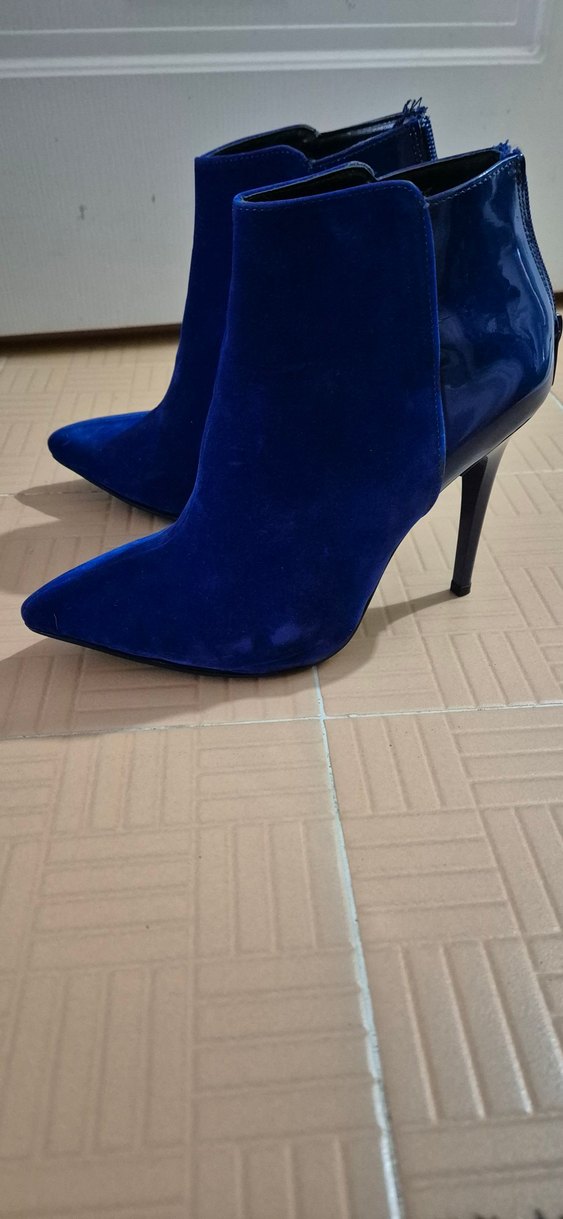 Parlak detaylı, lacivert süet malzemeden yapılmış ince topuklu botlar. Cesur ve gösterişli tarzı ile romantik akşamlar için uygun.