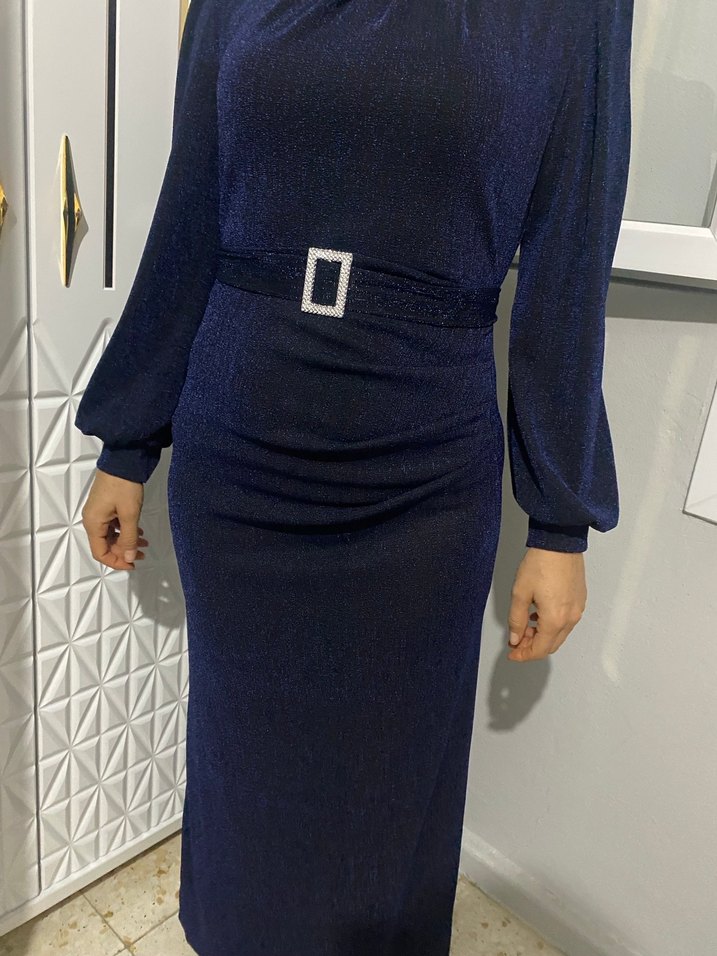 Parlak lacivert renkte, uzun ve vücuda oturan bu abiye elbise, tekne yakalı ve askılı kolludur, kemer detayıyla modern bir görünüm sunar. ✨