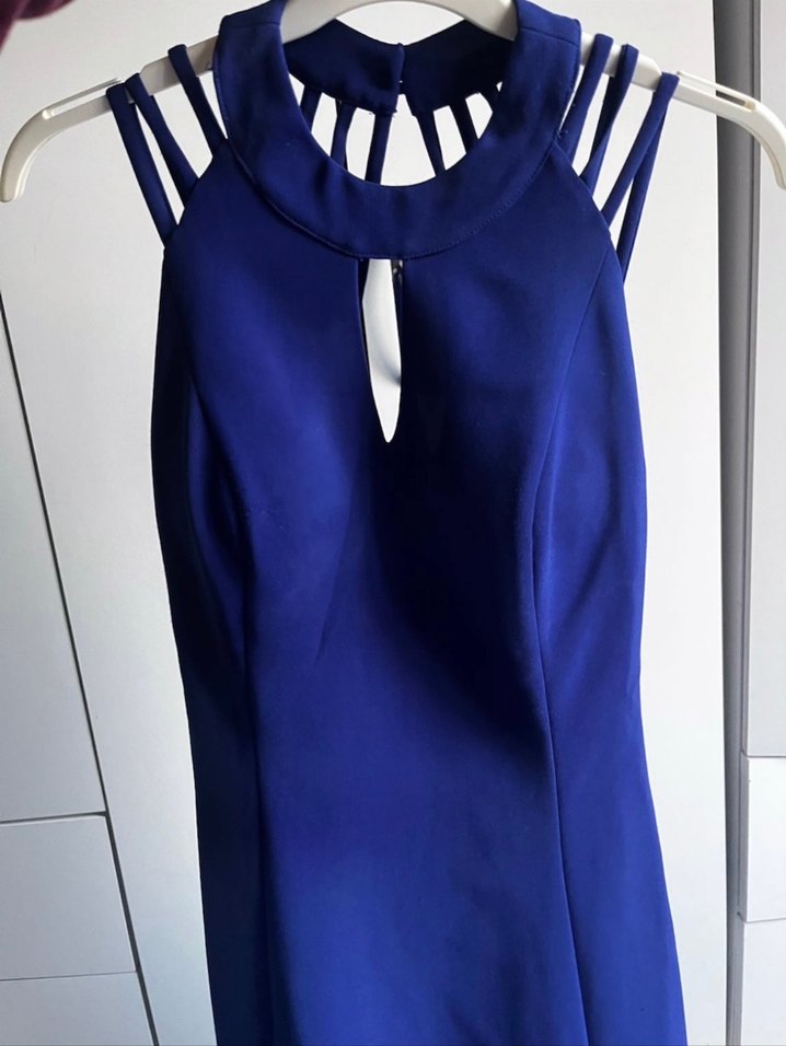 Parlak lacivert renkte, V yakalı ve askılı, uzun boylu, yırtmaç detaylı, dar kesim abiye elbisedir.Arkasındaki ipler ayarlanabilir