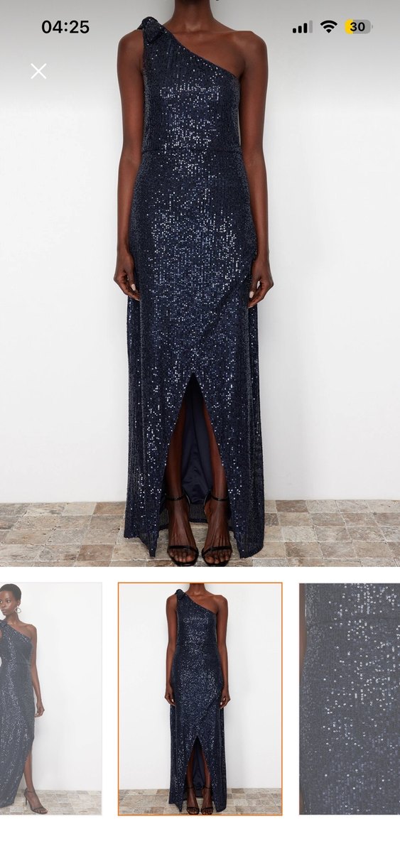 Parlak lacivert sentetik kumaştan, drapeli ve askılı uzun abiye elbise. V yırtmaç kesimi ve şık duruşuyla romantik akşamlar için uygundur.