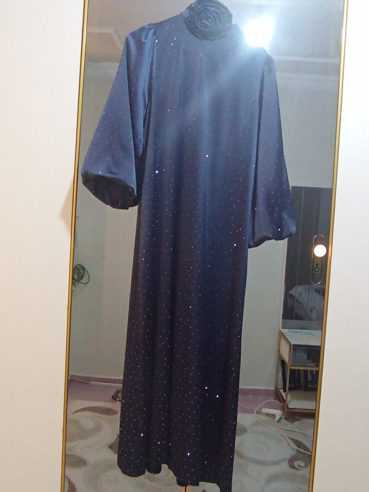 Parlak lacivert renkte, uzun kollu, dökümlü ve bol kesim kadın elbisesi. İpek gibi kumaştan, gösterişli goth tarzıyla düğünlere uygun. ✨
