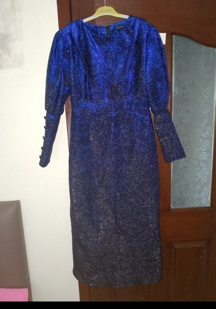 Parlak Lacivert Uzun Kollu Abiye Elbise