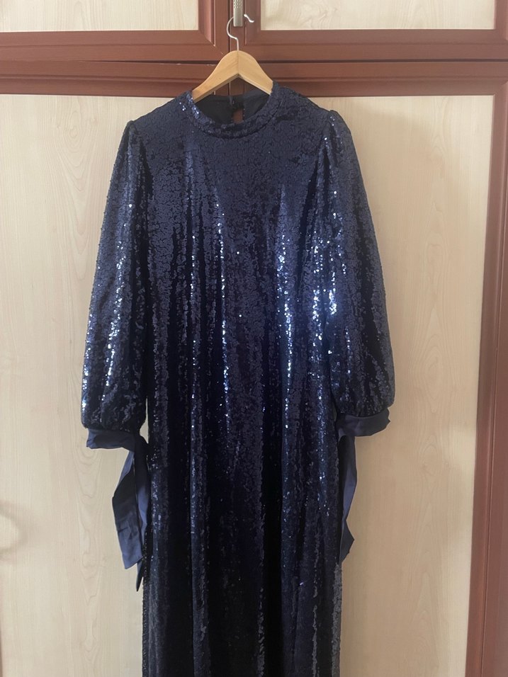 Parlak payetlerle kaplı, yüksek yakalı ve uzun kollu, bol kesim lacivert uzun abiye elbise. Drapeli tasarımıyla partiler için göz alıcı goth tarzı sunar. ✨ Özel dikimdir.