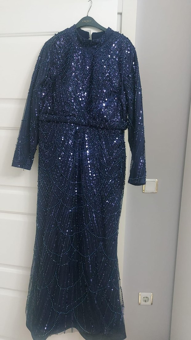 Parlak Lacivert Uzun Kollu Balık Abiye