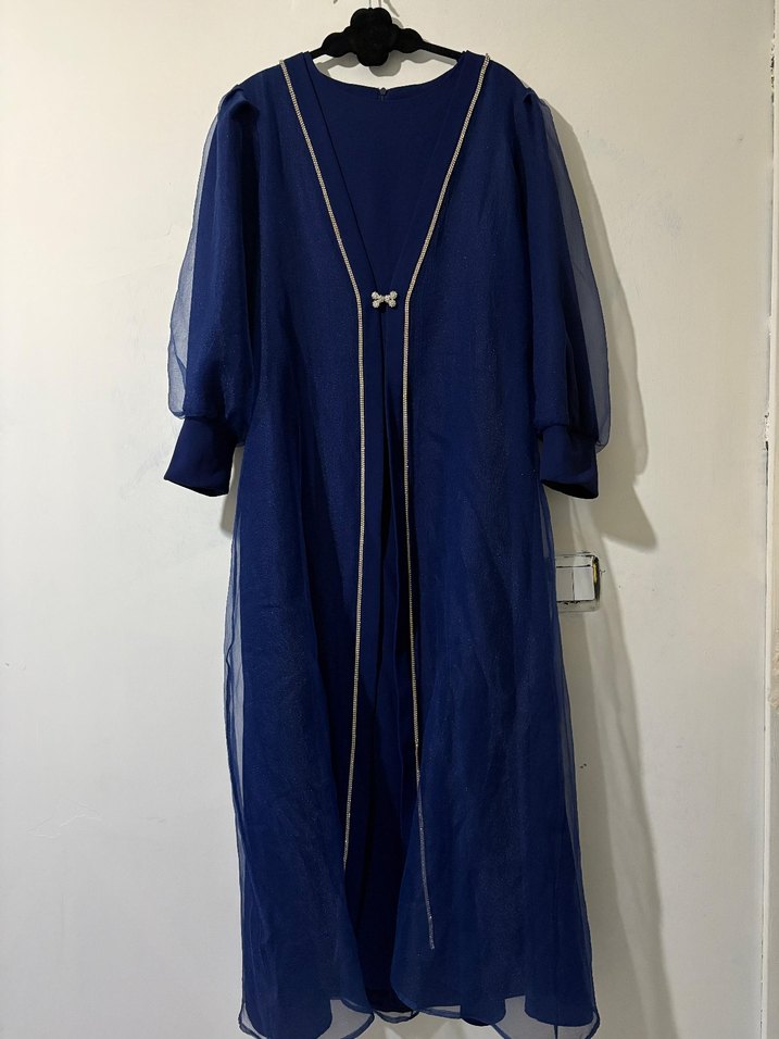 Parlak lacivert renkte, uzun kollu ve bol kesim kadın elbisesi. Modern klasik Paris tarzını yansıtan, önünde zarif bir detay bulunur.