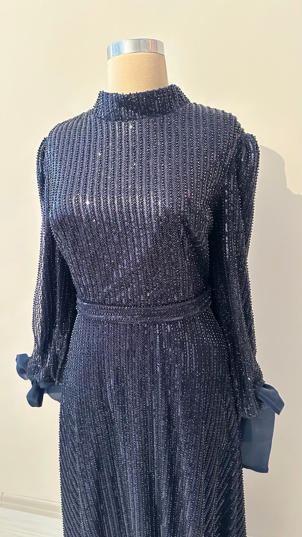 Parlak Lacivert Uzun Kollu Pilili Abiye Elbise