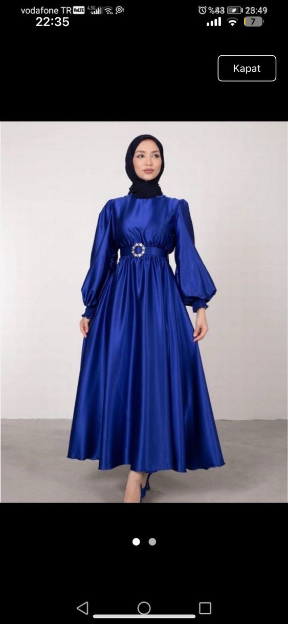 Parlak saten kumaştan, uzun kollu ve kayık yakalı lacivert uzun elbise. Bol kesim ve kemerli, düğünler için uygun.