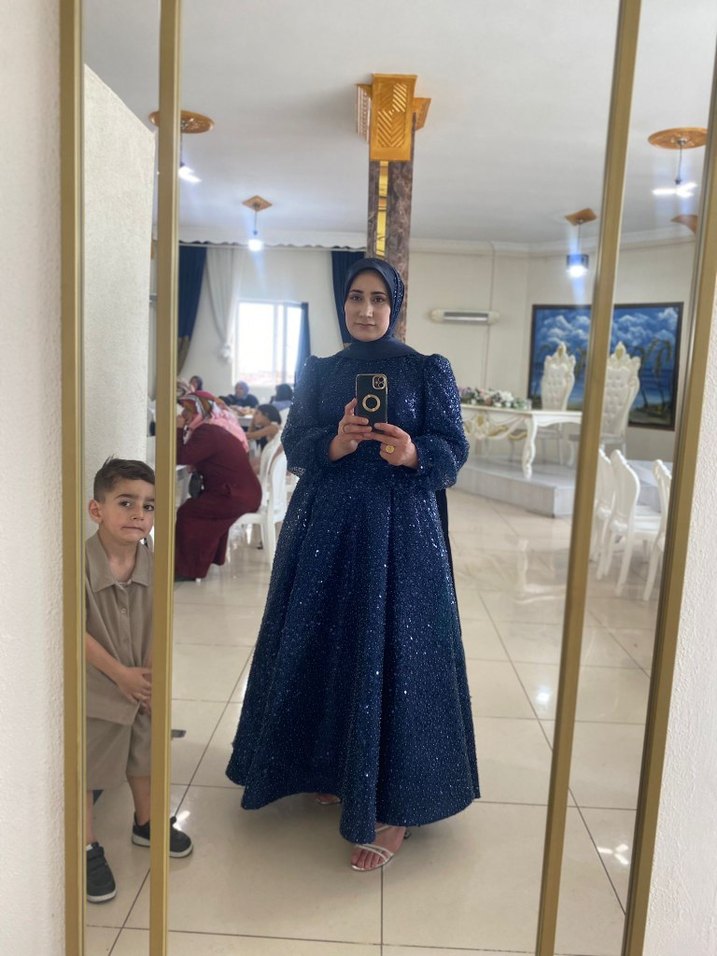 Parlak detaylara sahip, yüksek yakalı ve uzun kollu lacivert uzun abiye elbise. Düz kesim ve mütevazı, geleneksel tarzda, düğünler için uygun. ✨