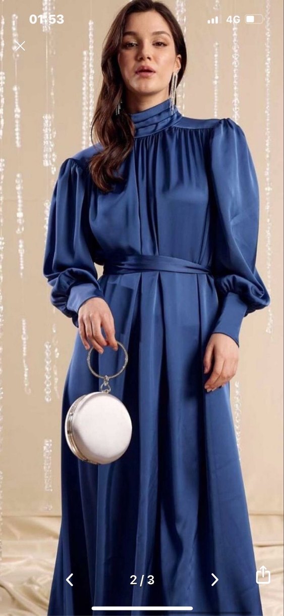 Parlak lacivert uzun elbise, yüksek yakalı ve bileklerde toplanan uzun kollu, bol kesimdir. Kuşaklı ve saten kumaştandır, düğünler için uygundur.