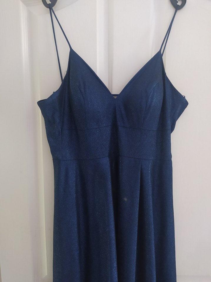 Parlak kumaştan, V yakalı ve askılı, uzun boy, drapeli ve dar kesim lacivert elbise, parti için uygun. uzun yırtmaçlı dekolteli elbise Boy:1.65