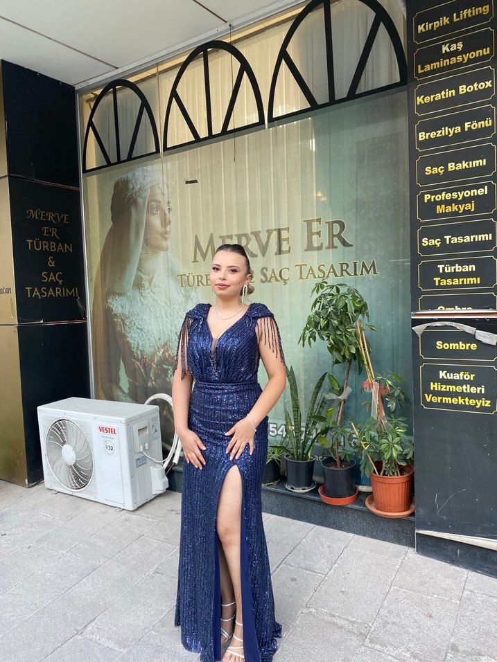 Taşlı Lacivert V Yaka Uzun yırtmaçlı Abiye Elbise