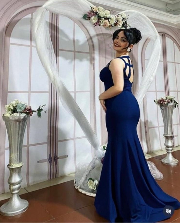 yarı Parlak lacivert kumaştan, V yakalı ve askılı, modern klasik tarzda, drapeli ve vücuda oturan uzun abiye elbisedir. Düğünler için uygundur.
