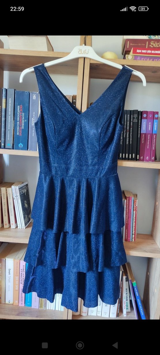 Parlak lacivert kumaştan, V yakalı ve kolsuz, volanlı midi elbise. Fitted kesimiyle parti için uygun şık bir model. ✨
