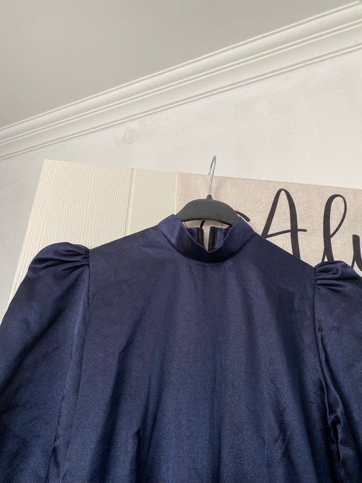 Parlak lacivert renkte, yüksek yakalı ve uzun kollu, bol kesim abiye İpeksi dokusu ve drapeli tasarımıyla günlük kullanıma uygundur. ✨