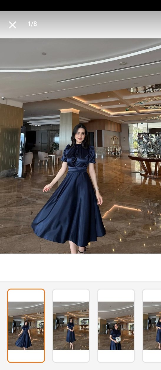 Parlak lacivert, saten görünümlü, yüksek yakalı ve kısa kollu uzun elbise. Dökümlü kesimiyle klasik ve modern tarzı bir araya getirir. Düğün için uygun.sadece 2 saatlik giyildi