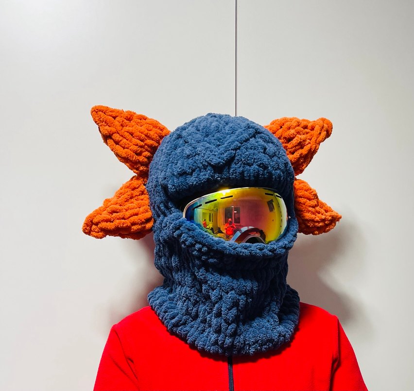 Kadınlar için renkli ve örgüden yapılmış avant-garde bere, turuncu detaylar ve koyu mavi tabanıyla dikkat çeker.
