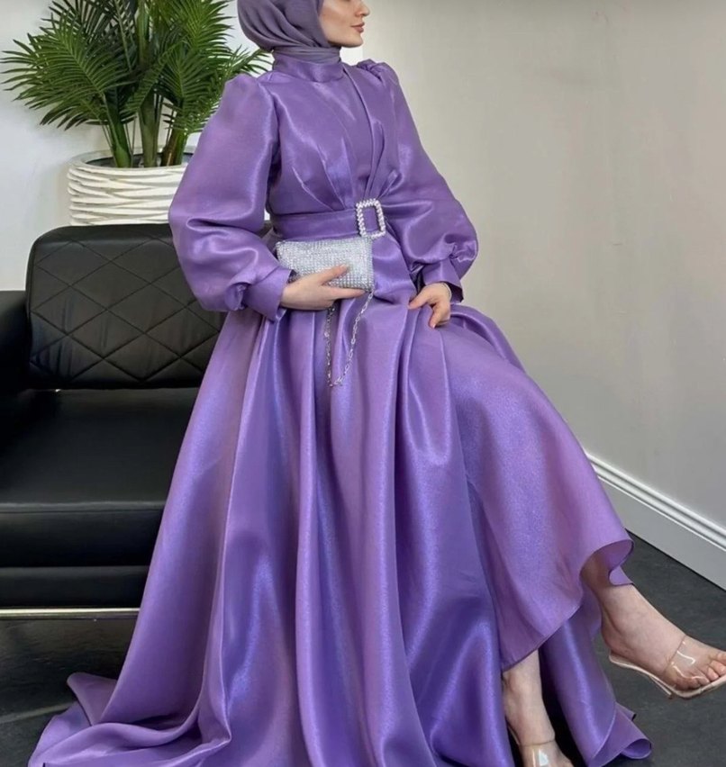 Parlak kumaştan, drapeli tasarıma sahip uzun mor abiye elbise. Yüksek yakalı, uzun kollu ve bol kesimdir, düğünler için uygundur.
