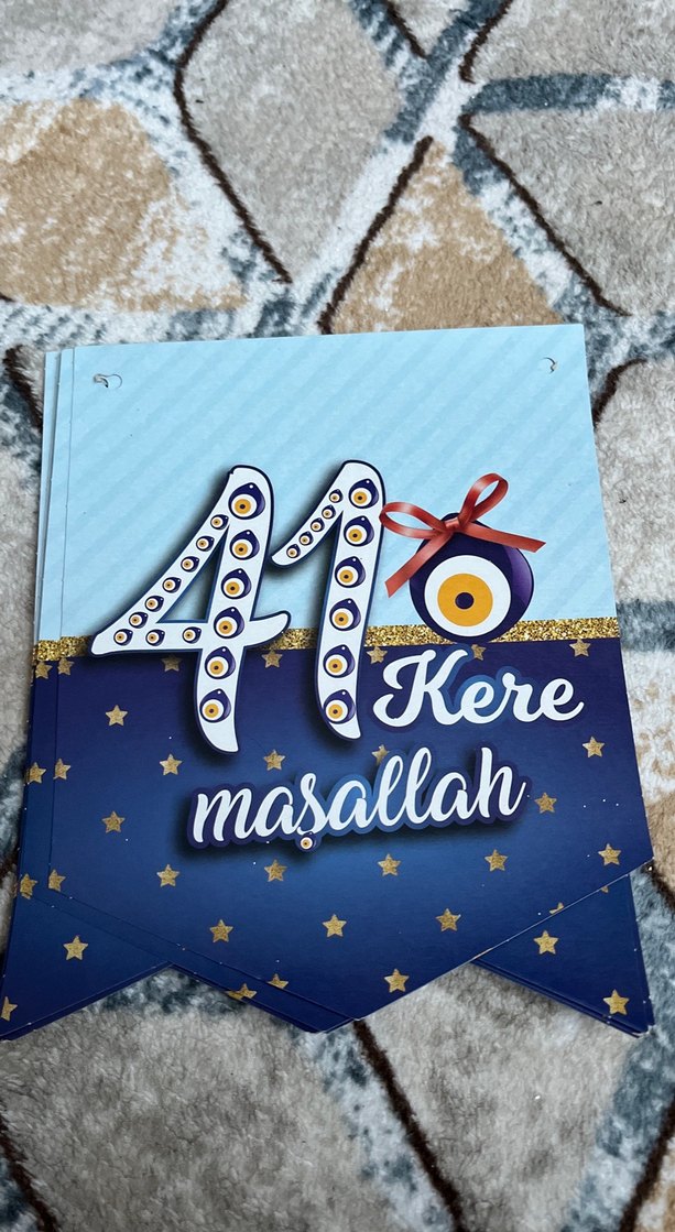 Parlak mavi renkte, 41 sayısı ve nazar boncuğu figürüyle süslenmiş "Kere maşallah" yazılı parti süsü. ✨