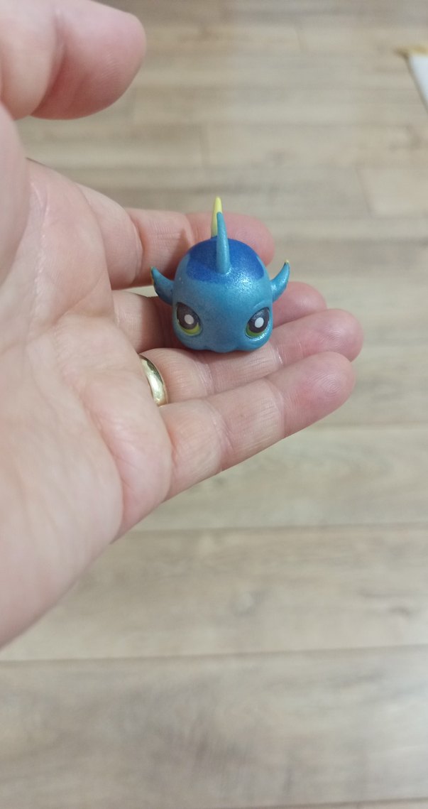 Parlak mavi renkte, büyük gözlü ve boynuzlu küçük bir karakter başı aksiyon figürü.
