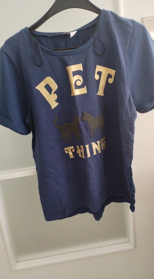 Parlak mavi renkli sokak stili kedi kıyafeti, baskılı yazı ve kedi figürleri içerir.