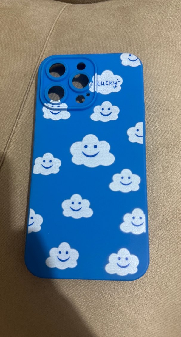 Parlak mavi yüzeyli, pastel renkli gülen bulut desenleriyle süslenmiş telefon kılıfı. Streetwear tarzında, çoklu kamera deliklerine uygun. Hiç kullanılmadı