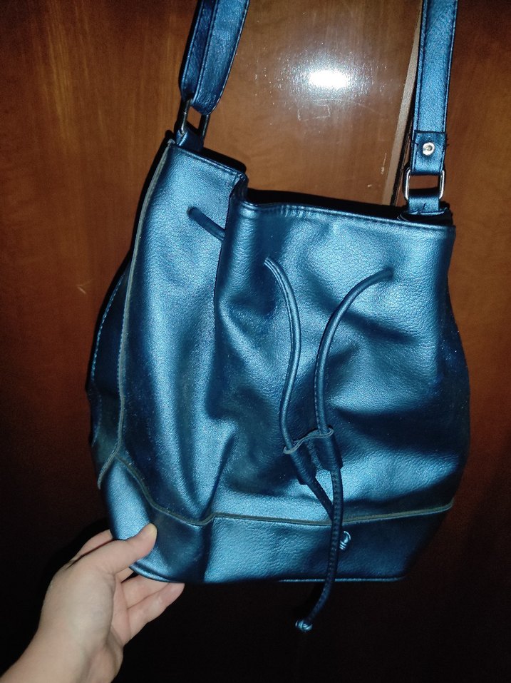 Parlak mavi renk, büzgü detaylı bucket model çanta. Uzun askılıdır. Genel durumu iyi, kullanıma bağlı hafif deformasyon mevcuttur.
