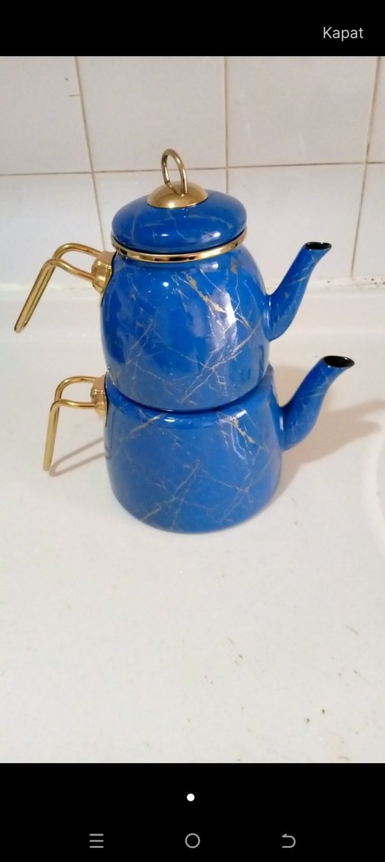 Alt ve üst kısmı çift katlı, parlak mavi renkli, altın detaylı ve mermer desenli çaydanlıktır.