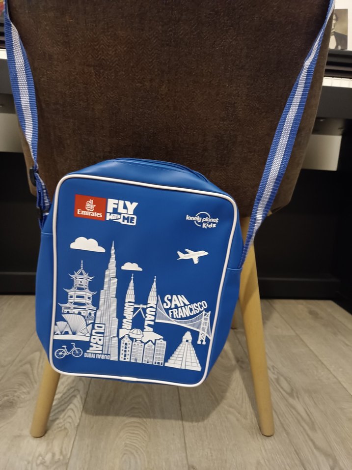 Parlak mavi renkte, şehir manzaralı ve 'FLY' yazılı çocuk çantası, uçak ve ünlü simgelerle süslenmiştir. ✈️