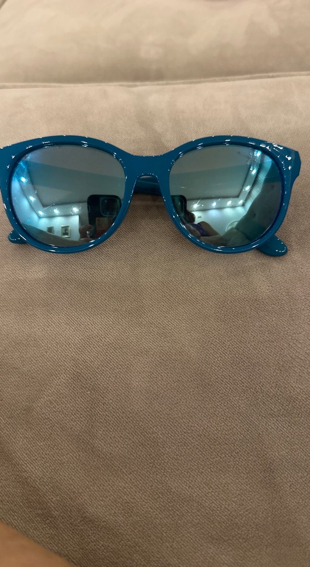 Parlak mavi çerçeveli, çağdaş tasarımlı güneş gözlüğü, moda öncüsü ve avangart sokak stiline uygun. İtalya’dan aldık, orjinal