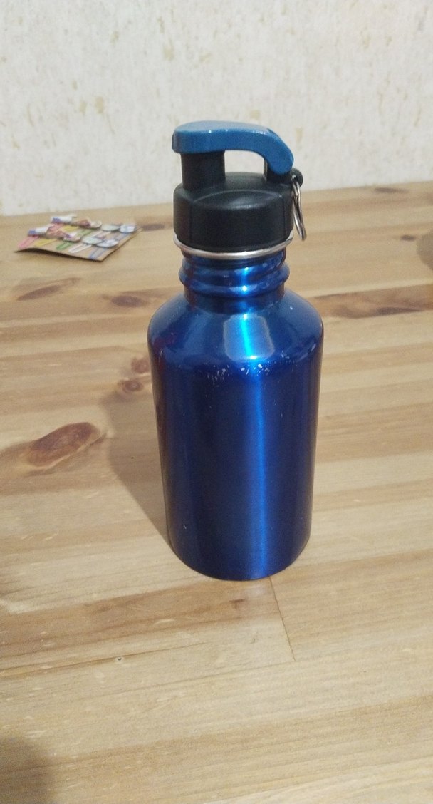 Parlak mavi renkte çocuk termos şişesi, kolay taşınabilir saplı siyah kapaklıdır. İçecekleri uzun süre sıcak veya soğuk tutar.