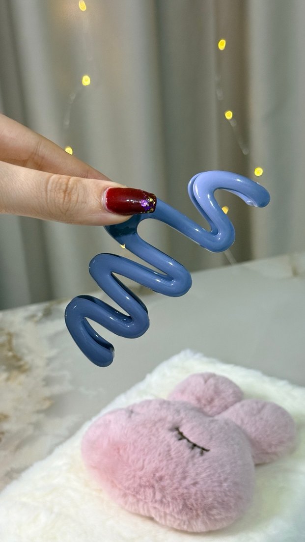 Parlak mavi plastikten yapılmış, dalgalı avant-garde tasarımlı saç tokası, renkli ve modaya uygun.