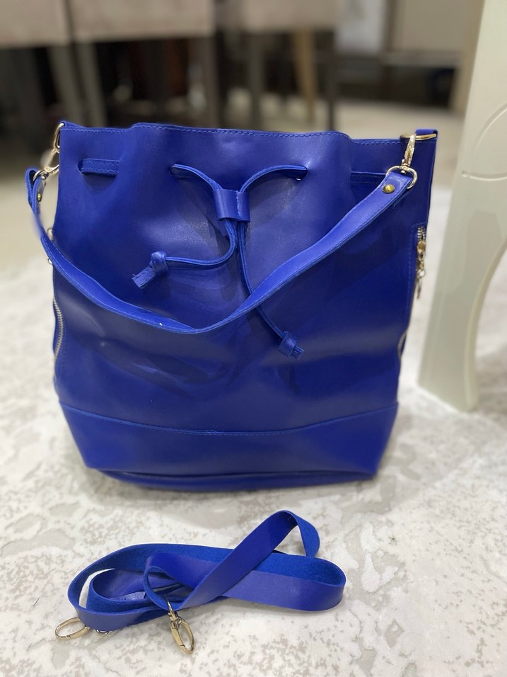 Parlak mavi deri kadın çantası, minimal tasarım ve tokalı detaylar içerir. Ayarlanabilir askısıyla günlük kullanıma uygundur.