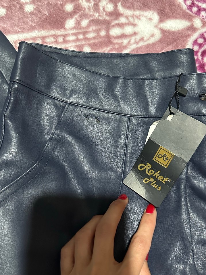 Parlak mavi deri mini şort, dar kesimli ve baskılı desenli. Sokak stili ve romantik buluşmalar için uygun.