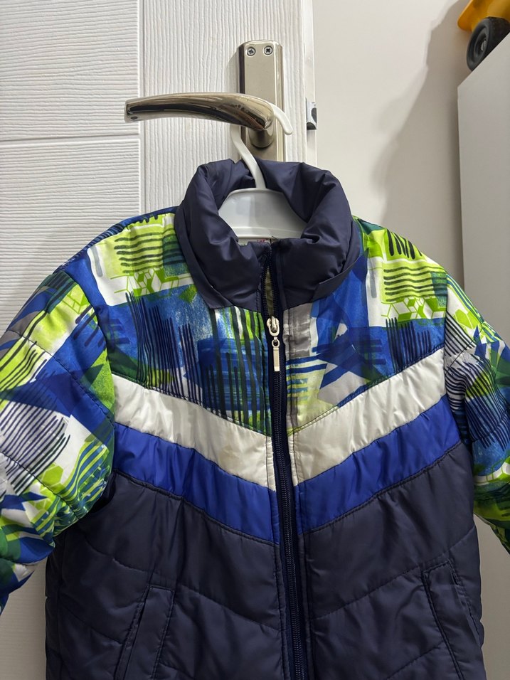 Fermuarlı, kesik yakalı, parlak mavi tie-dye desenli, streetwear tarzında, sıcak ve yumuşak kumaştan üretilmiş erkek mont. Şapkası yoktur Ukrayna ürünüdür